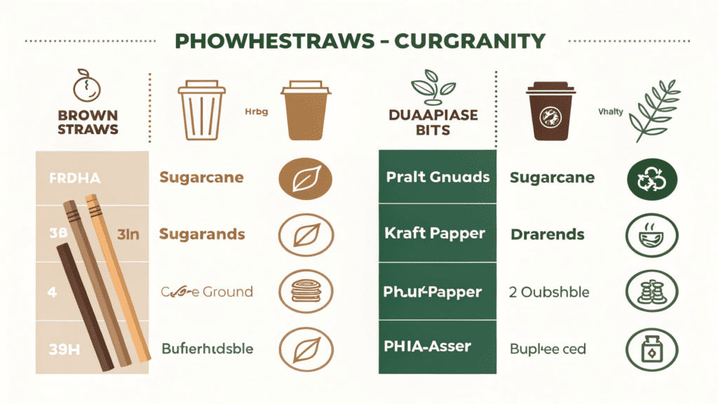 Brown straws are typically made from various eco-friendly and biodegradable materials chosen as alternatives to plastic. Common compositions include sugarcane fibers (bagasse) blended with PLA, reprocessed coffee grounds with PLA, FDA-approved kraft paper, agave fibers, wheat straw, wood pulp and vinegar, and advanced plant-based thermoplastics like PHA. These materials often give the straws their natural brown color.